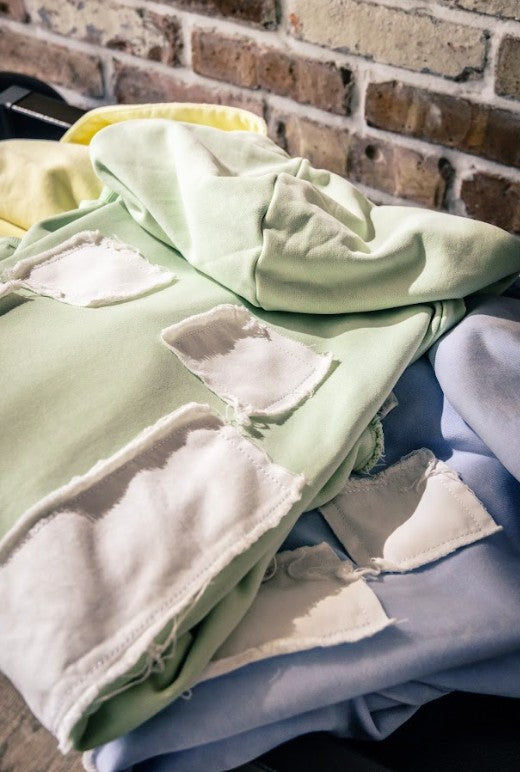 Lightweight semi oversized/cropped, garment-dyed cotton with raw open hem distressing that creates a bold, worn-in look . Finished with our exposed embroidered size tag and a 3-D loose thread distressed back logo appliqué.